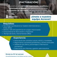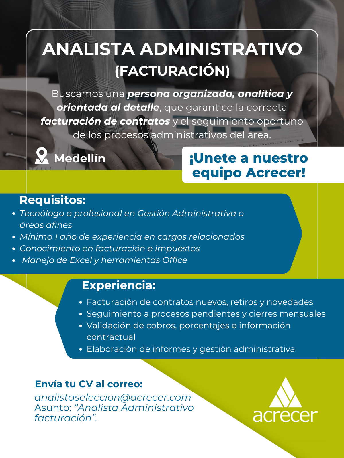 Mínimo 1 año en procesos administrativos, facturación, cartera o áreas afines. Deseable experiencia en sector inmobiliario o servicios.